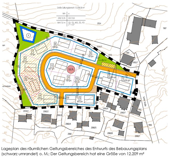 Der Entwurf des Bebauungsplans für das Gebiet der Flurnummern 2056 (Teilfläche), 2058 (Teilfläche), 2058/3 und 2058/5 je der Gemarkung Teisnach, siehe unten abgedruckten Lageplan mit eingetragenem Planungsbereich, und der Entwurf der Begründung mit Umweltbericht sowie die vorliegenden umweltrelevanten Informationen liegen im Rathaus des Marktes Teisnach (Zimmer Nr. 7, Prälat-Mayer-Platz 5, 94244 Teisnach) vom 05.11.2024 bis einschließlich 11.12.2024 während den allgemeinen Dienstzeiten (s.u.) öffentlich aus.