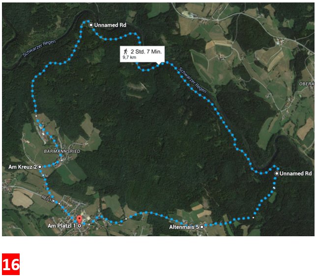 Der Weg führt entlang der Straße nach Bärmannsried am Sägewerk vorbei und geht in den Wald. Mit Beginn des Waldes verlässt man für etwa 7 km jegliche Zivilisation. Der Weg führt durch die Regenhangwälder direkt neben dem Fluss Regen und geht weiter zur Ortschaft Altenmais. Von hier benutzten wir die wenig befahrene Straße nach Kaikenried.